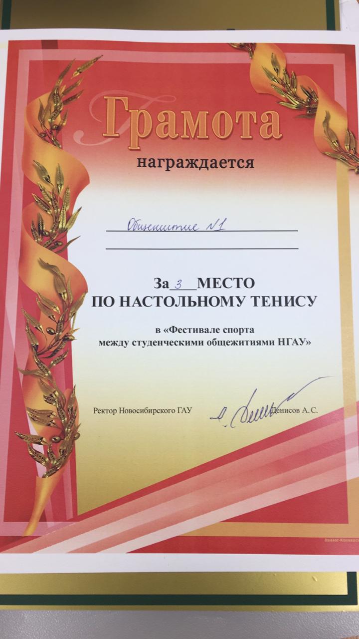3 апреля 2019 прошла спартакиада среди студентов, проживающих в общежитиях Новосибирского ГАУ. Команда общежития №1 факультета СПО заняла третье место по волейболу и настольному теннису.