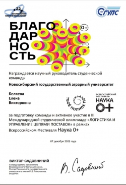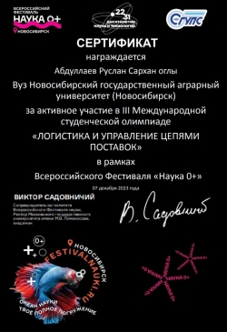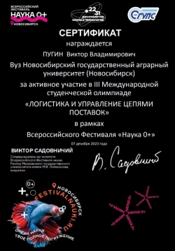 7 декабря 2023 года на базе ФГБОУ ВО "Сибирский государственный университет путей и сообщания" прошла III Международная студенческая олимпиада «ЛОГИСТИКА И УПРАВЛЕНИЕ ЦЕПЯМИ ПОСТАВОК» в рамках Всероссийского Фестиваля «Наука 0+», где студенты факультета Экономики и управления (СПО), обучающиеся по специальности "Коммерция" (Пугин Виктор, Кагадеев Глеб, Абдуллаев Руслан) приняли активное участие.
